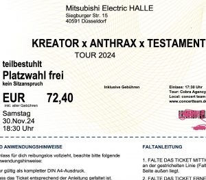 On November 30, 2024, Düsseldorf will host a powerhouse thrash metal event at the Mitsubishi Electric Halle with Kreator, Testament, and Anthrax sharing the stage. It’s shaping up to be an unforgettable night of classic thrash from some of the genre’s most legendary bands!